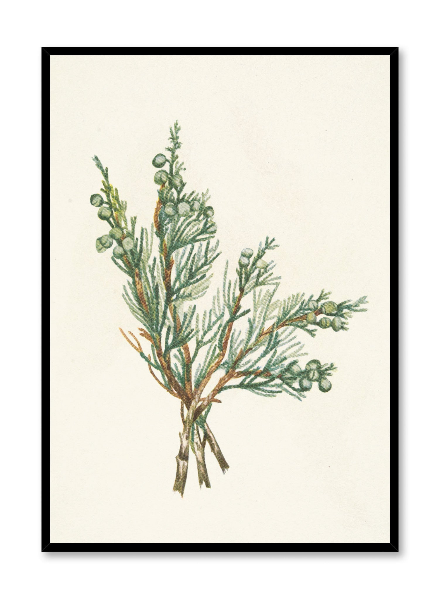 This delicate botanical illustration focuses on a sprig of juniper, with its soft green needles and clusters of small, pale berries. The fine detailing in the branches and the muted tones give the piece a natural and subtle elegance, standing out against the plain background.