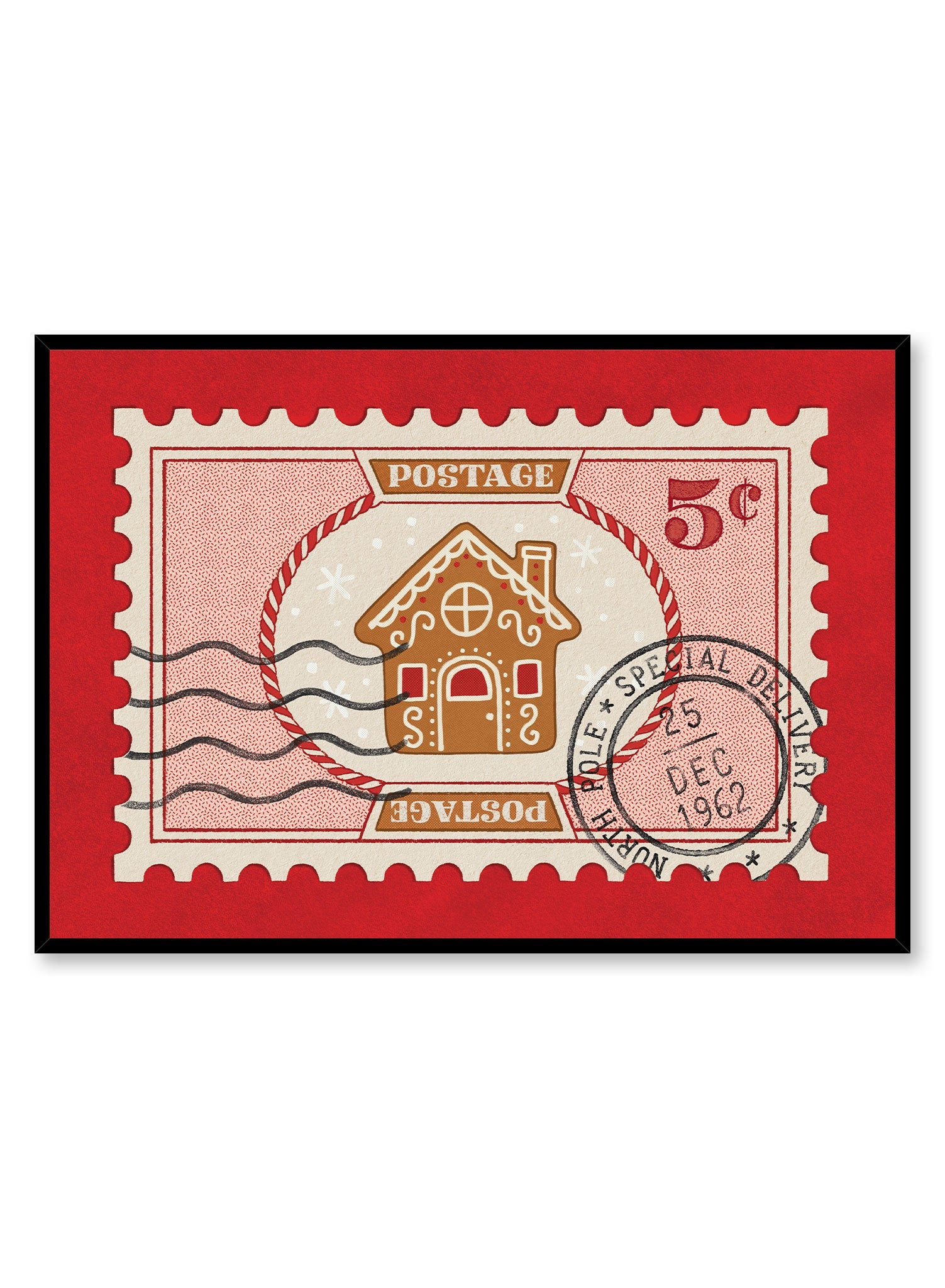 This festive artwork depicts a stylized postage stamp, featuring a quaint gingerbread house in warm brown and white tones. The intricate details of the gingerbread house, from the curved roof to the decorative icing along the windows and doors, evoke the coziness of holiday baking traditions. The red border of the stamp contrasts with the soft, snowy backdrop, drawing attention to the charming house at its center.