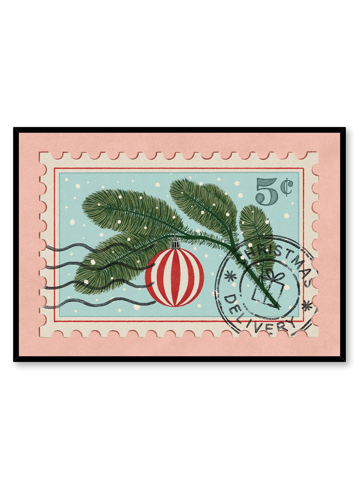 This artwork features a vintage-style postage stamp with a branch of a Christmas tree, adorned with a classic red ornament. The delicate needles of the branch are carefully detailed, while the bold red ornament adds a pop of color against the soft blue background. The stamp design, complete with a festive postmark, evokes memories of receiving holiday cards in the mail.